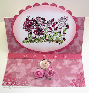 Spring must be on the way because I've been raring to go today. I did my ironing straight after breakfast and put it all away - my least favourite job. I washed all the dishes, fed the birds and the cats and then sat and made two cards! This one is an easel card made with a Ladybug Crafts Ink digi floral image. I coloured the image with Promarkers and cut it with a Spellbinders great oval nestie, backing it with the scalloped nestie. The card base was made by creasing and folding a Craft UK card. The pink pearlescent card is by Papermill and the backing paper is from a 12 x 12 First Edition Desert Blooms pad. The Card Candi was added to the easel stop and I cut two Spellbinders corners before adding three WOC pink roses. Finished! Voila, two in one day.